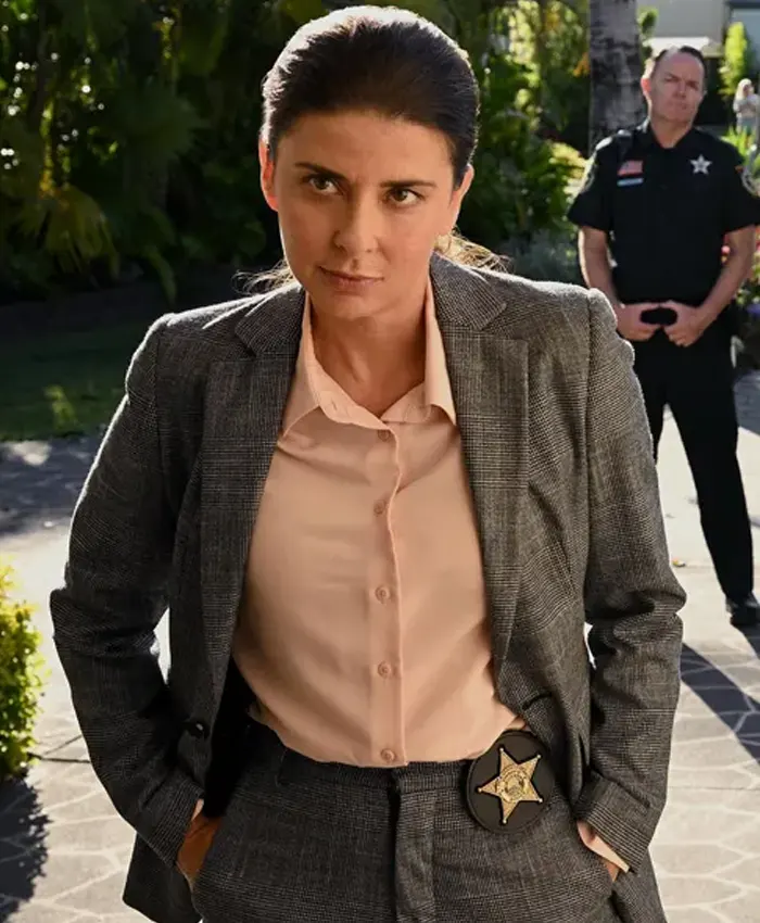 Jeanine Serralles Apples Never Fall 2024 Detective Elena Camacho Grey Blazer