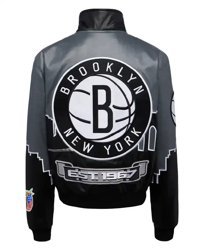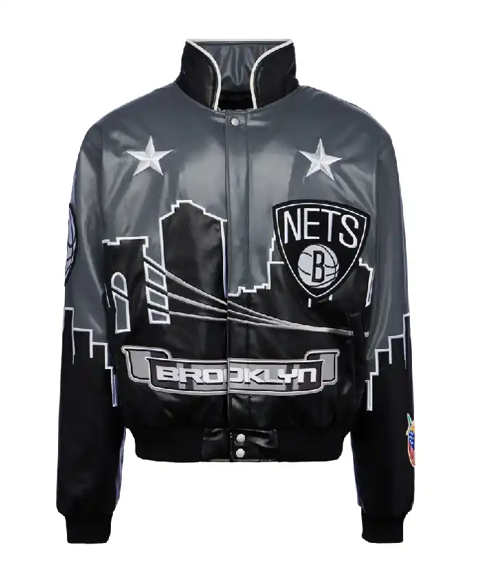 Jeff Hamilton Brooklyn Nets Skyline Vegan Black and Grey Leather Varsity Jacket For Men and Women