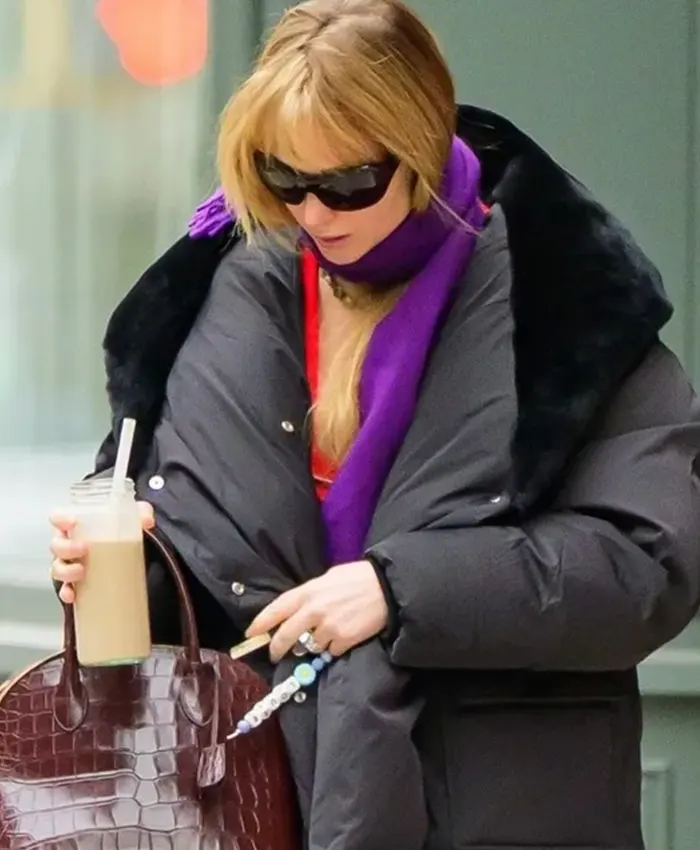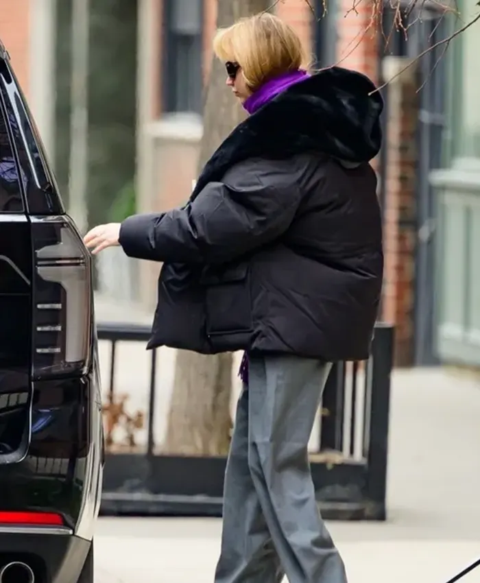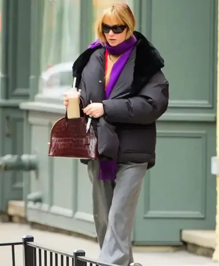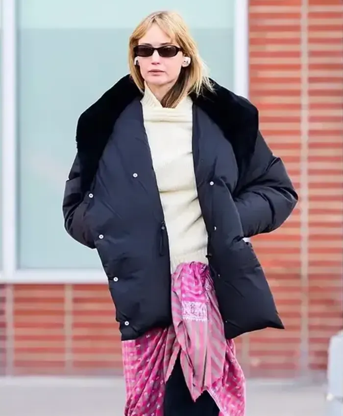 Jennifer Lawrence 2026 Black Parachute Fabric Puffer Coat For Womens