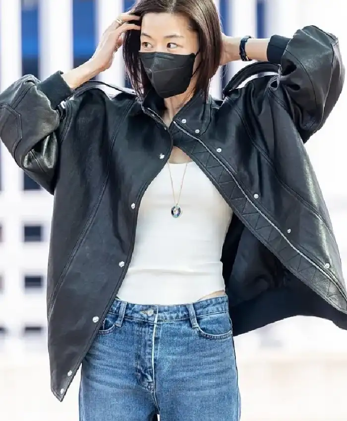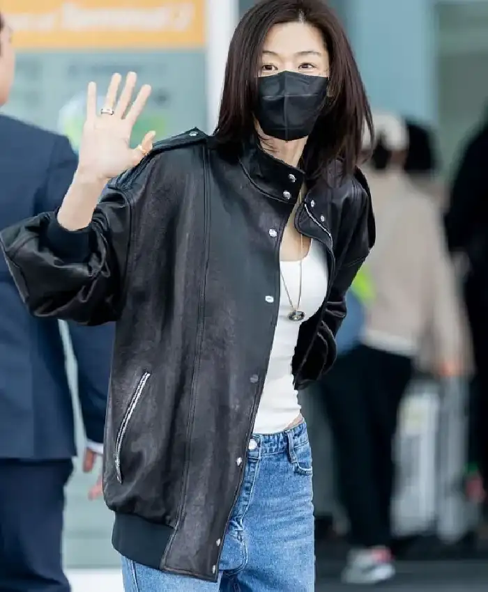 Jeon Ji-hyun Incheon International Airport 2026 Oversized Black Bomber Leather Jacket For Women