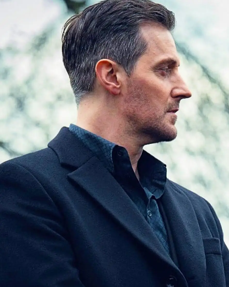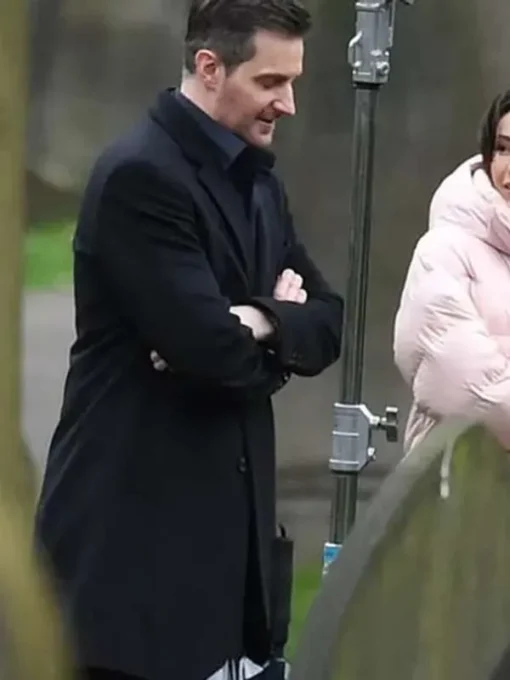 Joe Burkett Fool Me Once 2024 Richard Armitage Black Wool Trench Coat