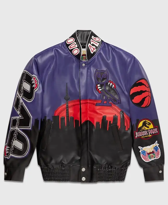 OVO Jurassic Park Purple And Black Leather Varsity Jacket For Men and Women On Sale