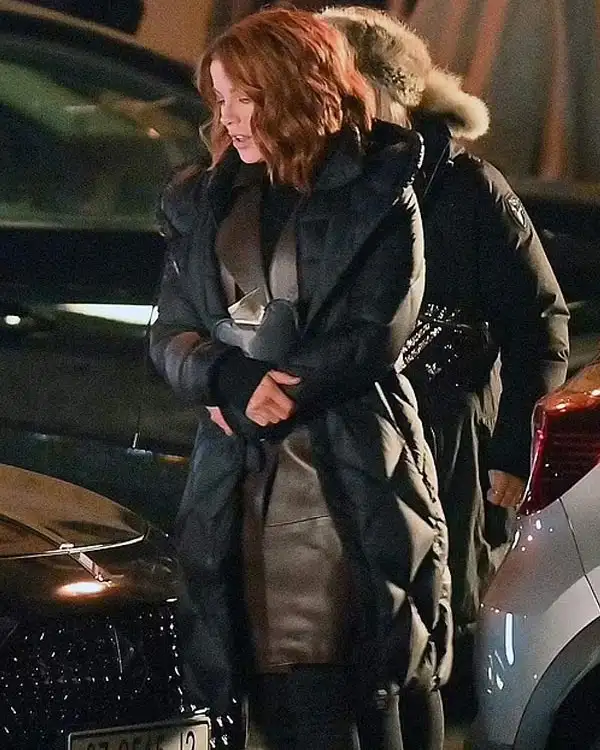 Avery Graves Movie Canary Black 2024 Kate Beckinsale Black Parachute Fabric Quilted Hooded Coat