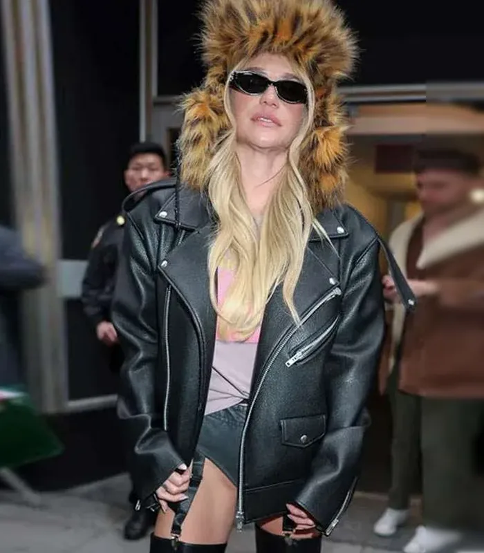 American Singer Kesha Street Style 2025 Black Biker Leather Jacket