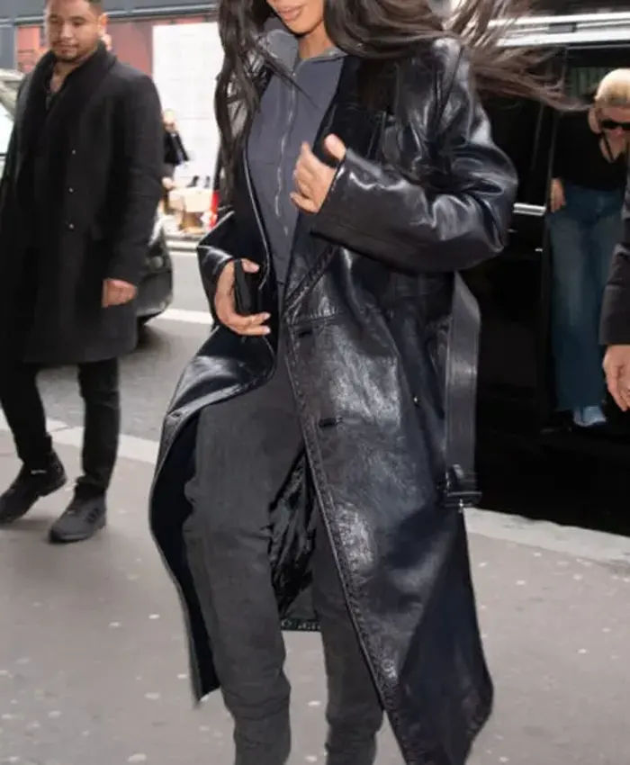 Shop Celebrity Kim Kardashian Trench Black Leather Coat