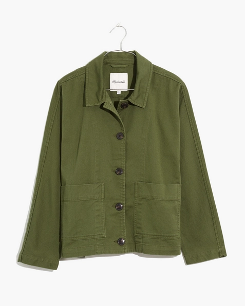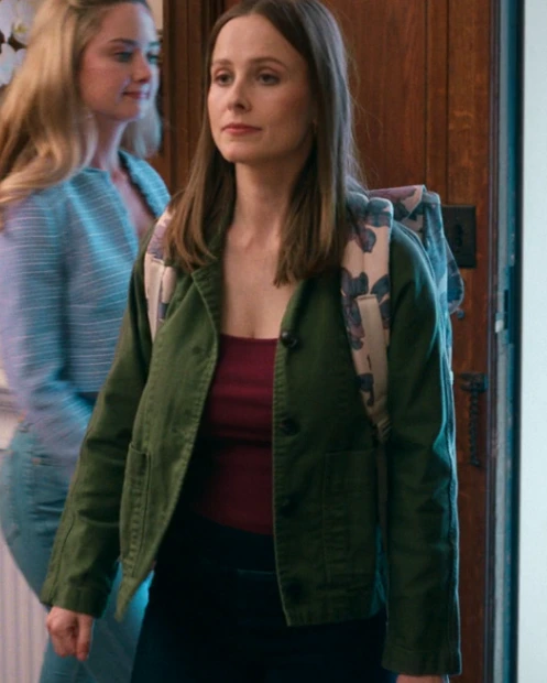 The jacket features full-length sleeves and a shirt-style collar, which adds a classic touch to her outfit. The open hem cuffs provide a relaxed fit that aligns with her laid-back yet fashionable approach to life at college. A buttoned closure secures the jacket while adding an element of sophistication. The striking green color symbolizes growth and freshness, mirroring Kimberly’s journey as she embraces new experiences and challenges in her college adventure.