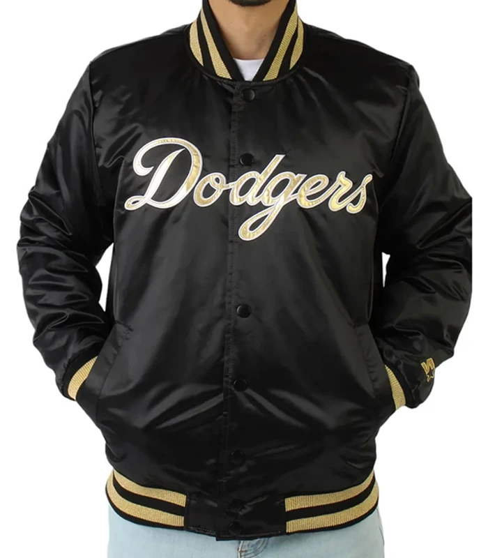 Los Angeles Dodgers Gold Patches Black Satin Jacket For Sale
