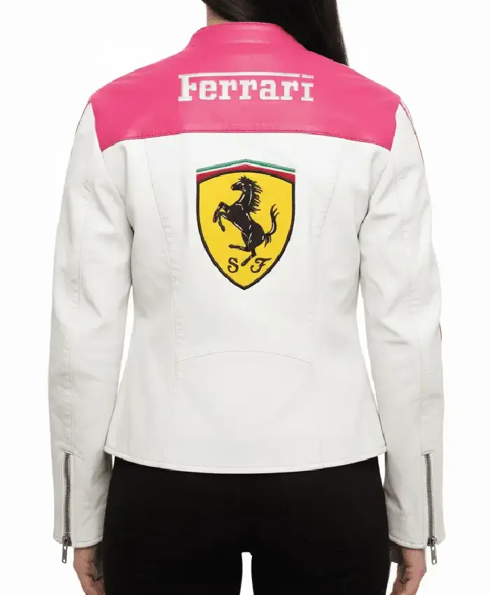 The Ladies Ferrari Pink Leather Racing Jacket is where speed meets style in the most eye-catching way. It is designed for women who love bold fashion plus the powerful spirit of racing.