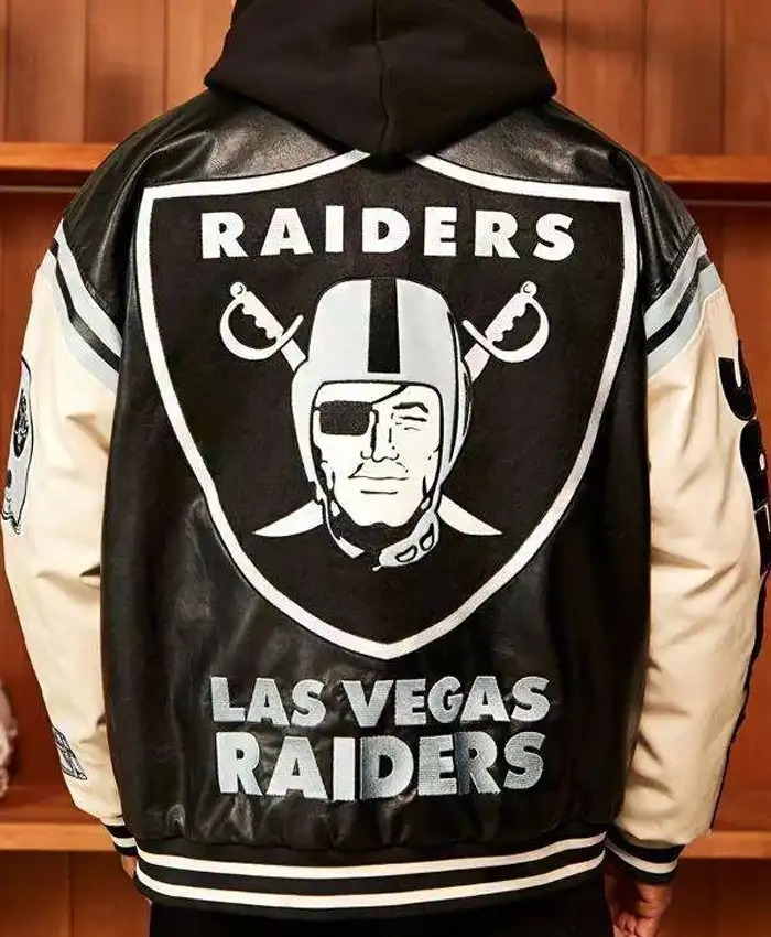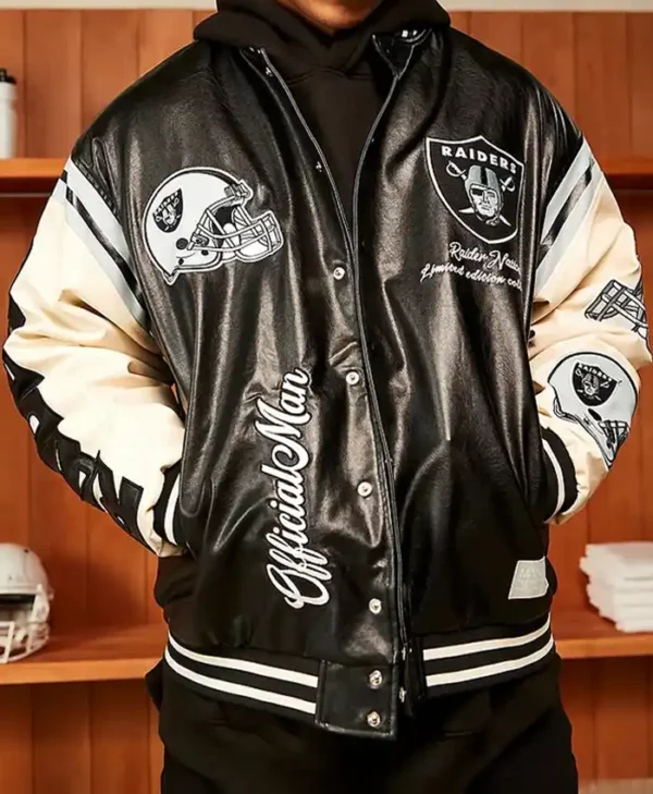 Las Vegas Raiders Black and Beige Leather Bomber Varsity Jacket