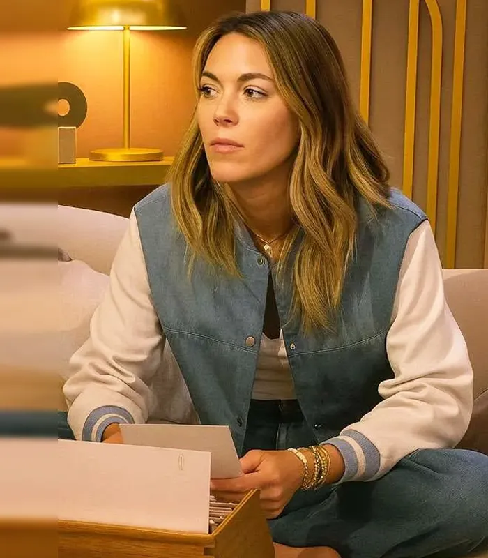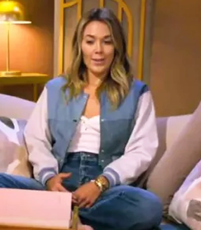 Megan Walerius Love Is Blind 2025 Blue and White Cropped Bomber Jacket
