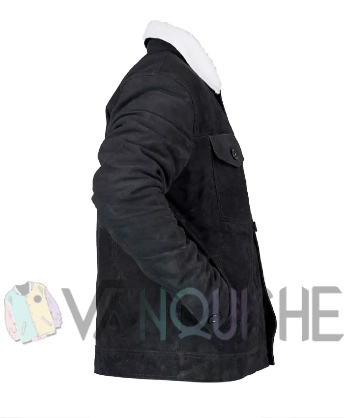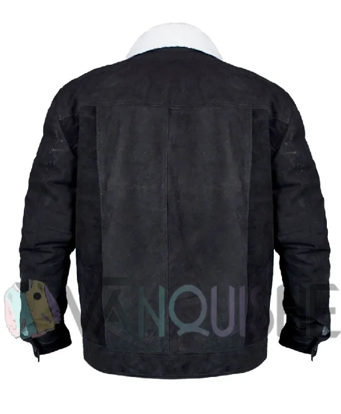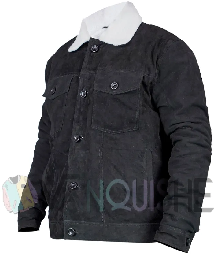 Jun Ha Love Life Augie Black Suede Leather Sherpa Fur Collar Trucker Jacket For Men