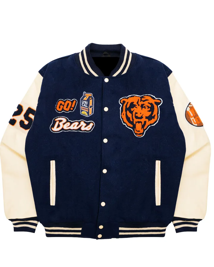 The style is both very classic and very new at the same time. Its body is a bright navy blue, and the sleeves are off-white leather, making a very striking contrast. The Chicago Bears’ logo, an angry bear head in bright orange, is proudly sewn on the chest, and the “GO! Bears” milk carton image adds a fun Lyrical Lemonade touch. On top of that, the big “25” on the sleeve completes the sporty look perfectly.