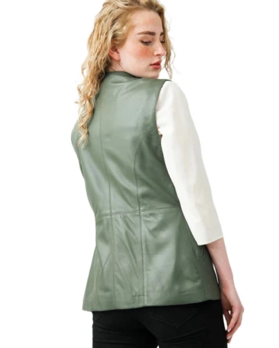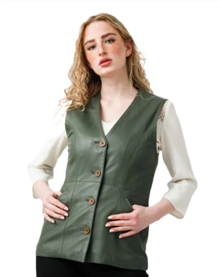 Buy Maria Button Closure V-Neck Green Leather Vest For Women On Sale