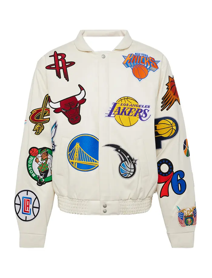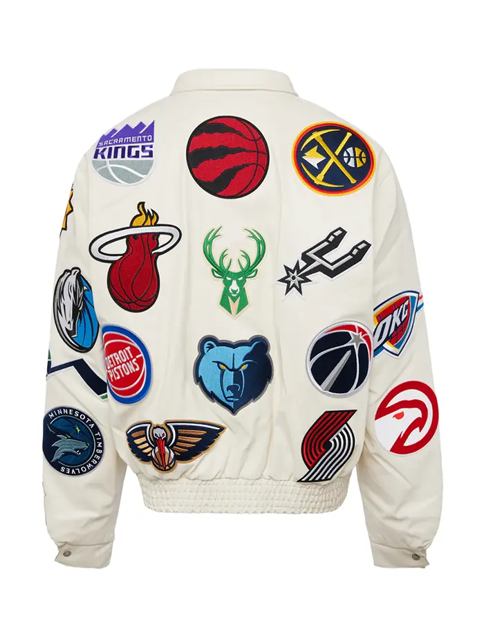 Buy Mateo NBA Patch White Leather Jacket With Classic Collar For Sale