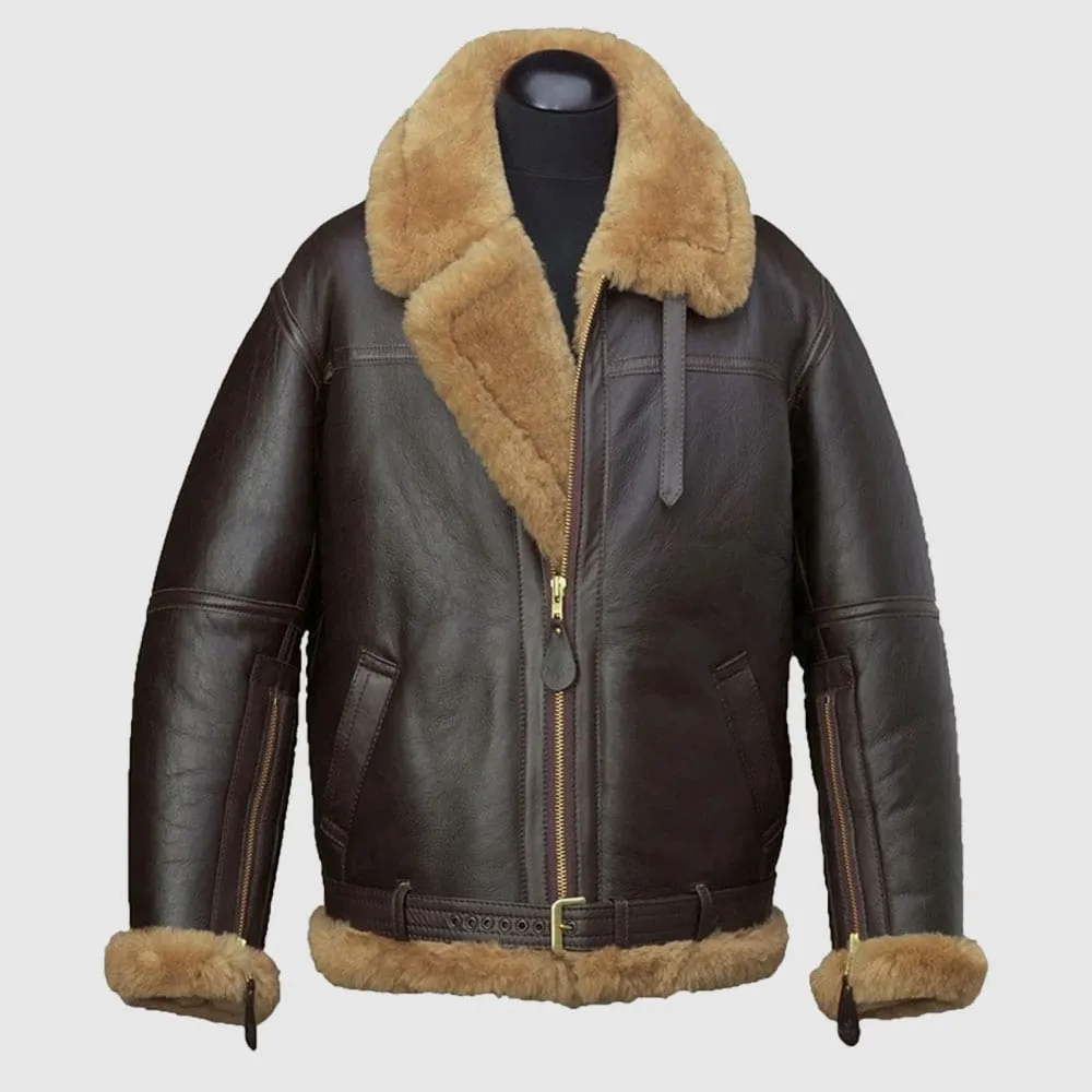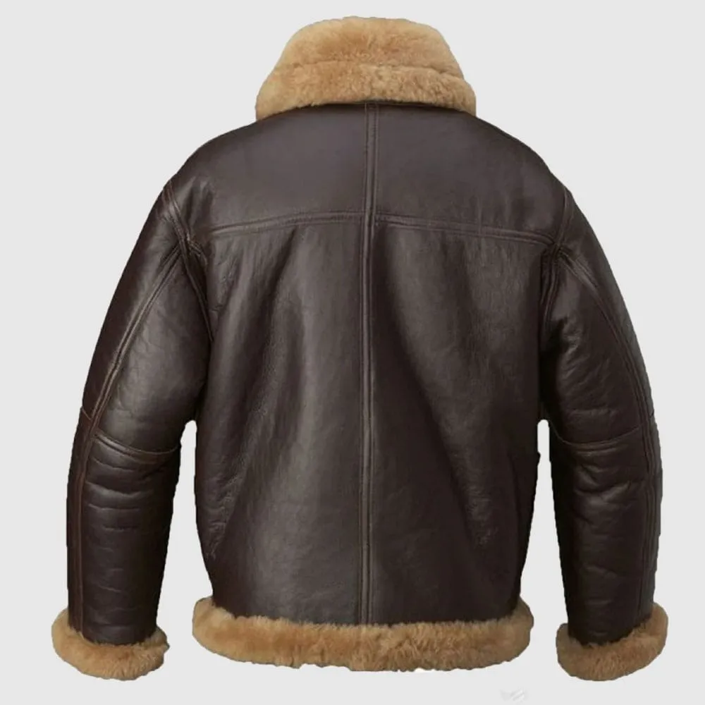 Mens B3 Bomber Brown Genuine Shearling Fur Black Leather Jacket