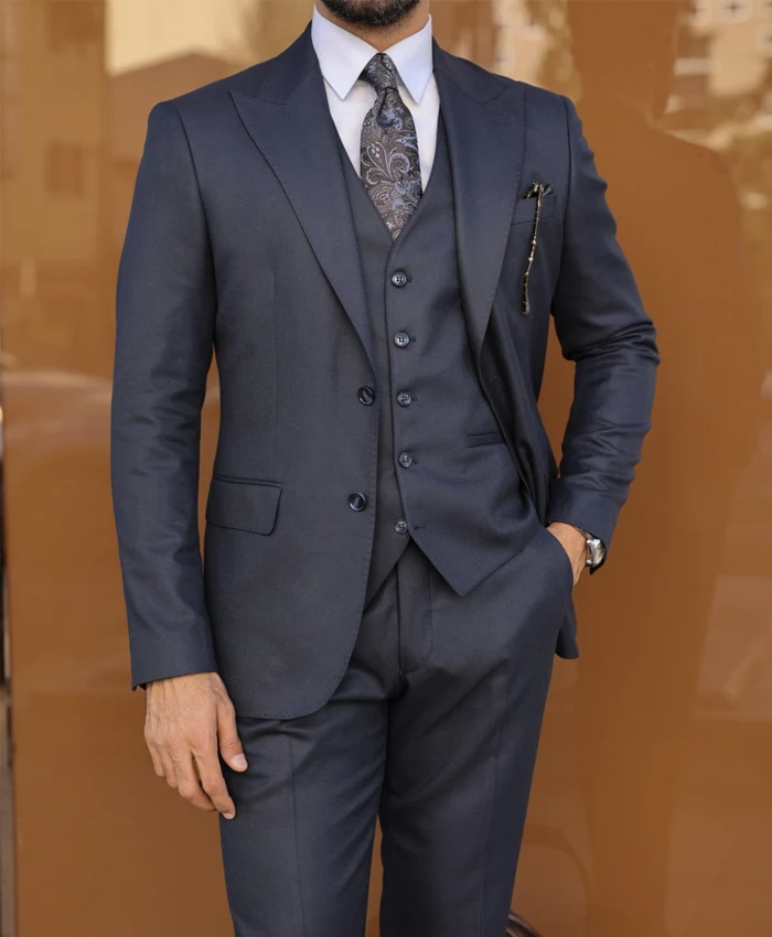 Three Piece Stylish Tailored Slim Fit Dark Blue Mens Suit