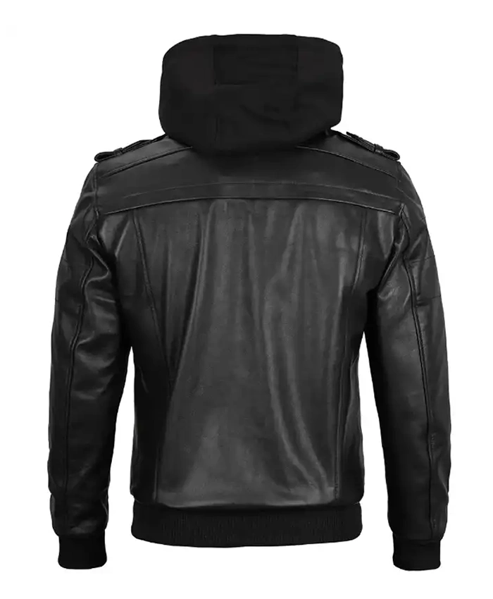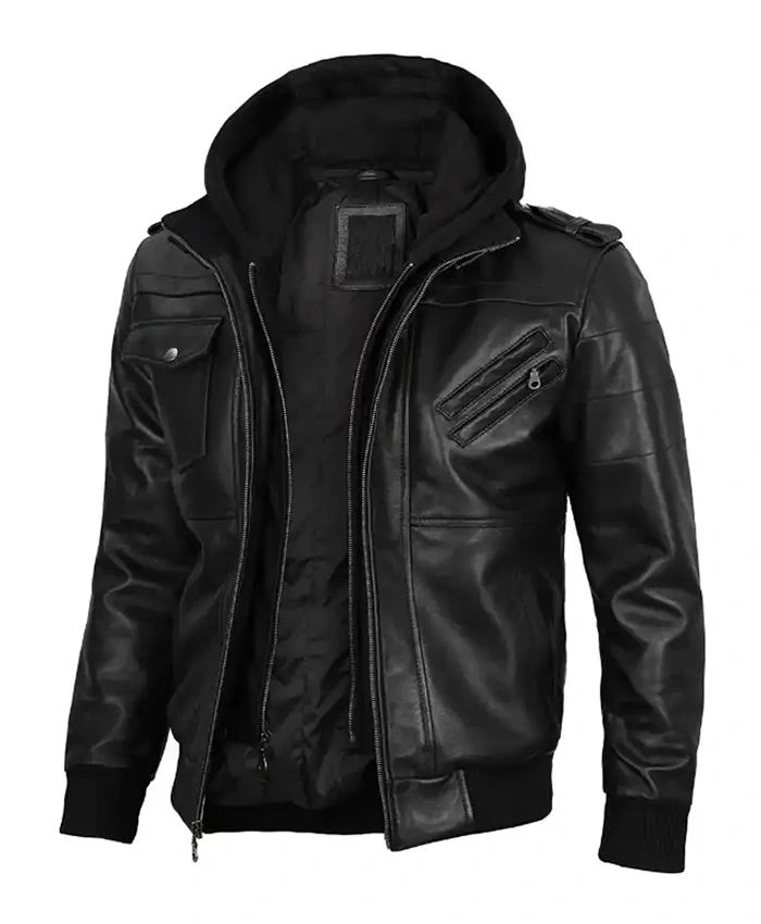Buy Men’s Genuine Leather Black Biker Hooded Bomber Jacket