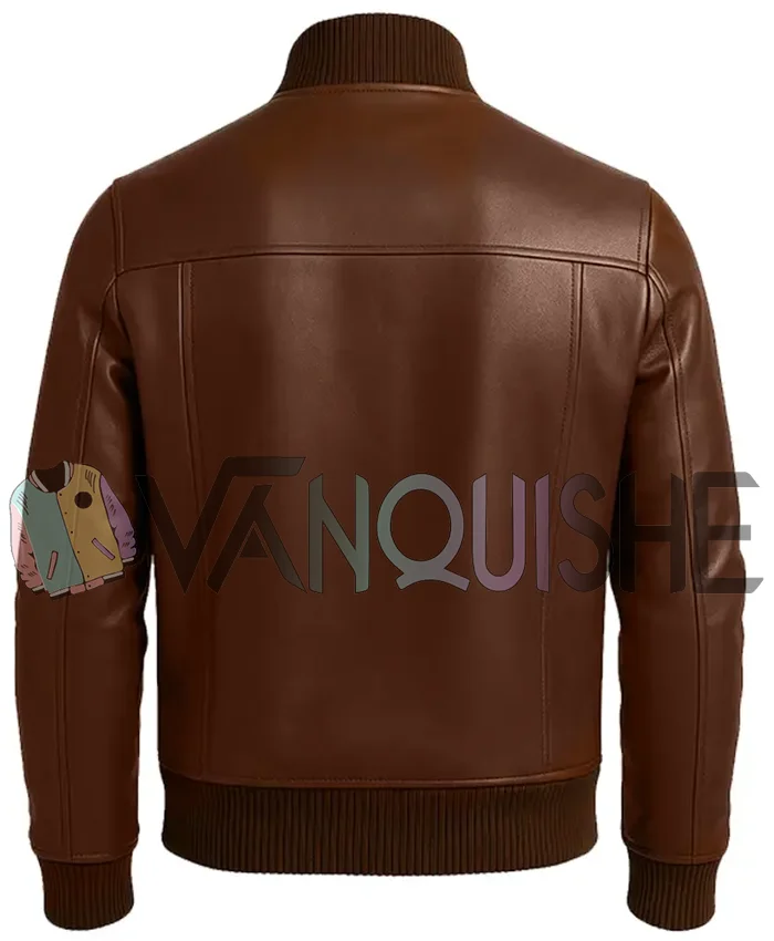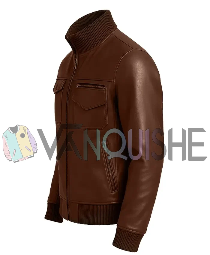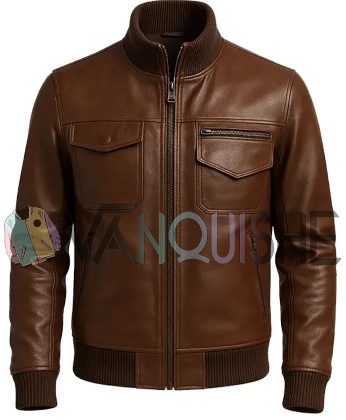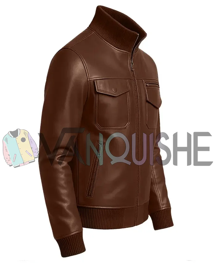 Mens Brown Four Pockets Rib Knitted Erect Collar Bomber Leather Jacket