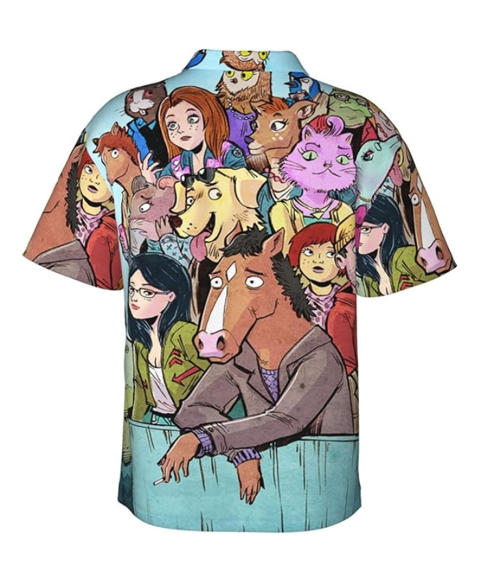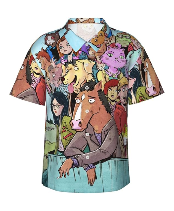The “BoJack Horseman Men’s Short Sleeves Colorful Hawaiian Shirt” is a vibrant and playful piece of clothing inspired by the beloved animated series. Featuring bold colors and unique designs, this shirt captures the essence of BoJack’s quirky personality and the show’s offbeat humor. It’s perfect for fans looking to express their love for the series while enjoying a casual, comfortable style.