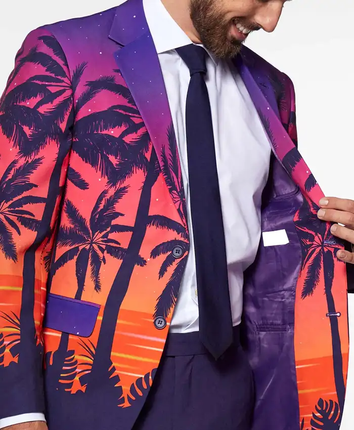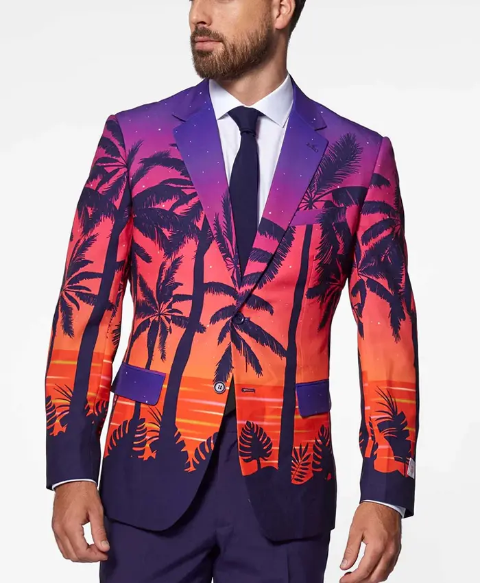 First off, let’s talk about the blazer. It’s crafted from Premium Suiting Fabric, which feels incredibly high-quality and looks sharp. The Colorful print is absolutely stunning, with vibrant palm trees against a beautiful sunset sky that will make you the center of attention. It features a stylish Lapel Shawl Collar and a classic Front Buttoned Closure. And get this it’s super practical, with Three Outside pockets and Two Inside pockets to stash all your essentials. Isn’t that great?