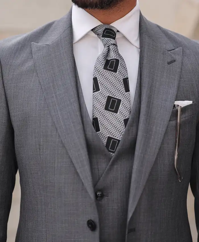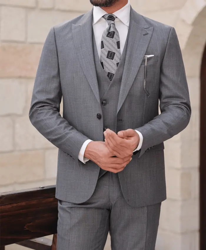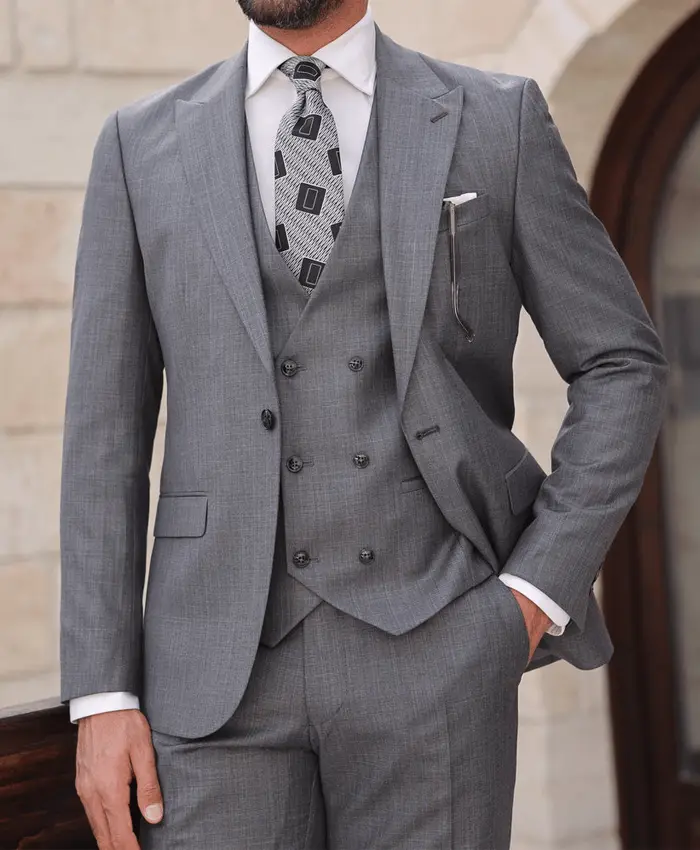 3 Piece Mens Tweed Grey Peak Lapel Suit For Wedding