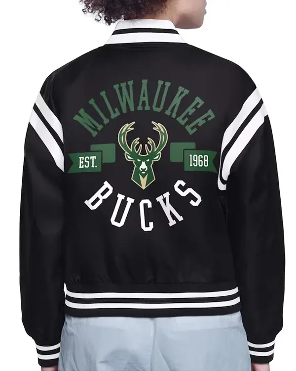 Milwaukee Bucks Printed Logo Black Varsity Satin Varsity Jacket For Men