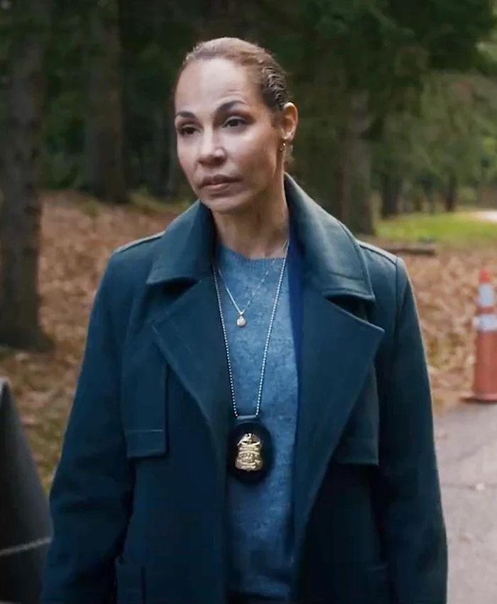 Amanda Brugel Movie Nika and Madison 2025 Detective Timmins Black Leather Coat