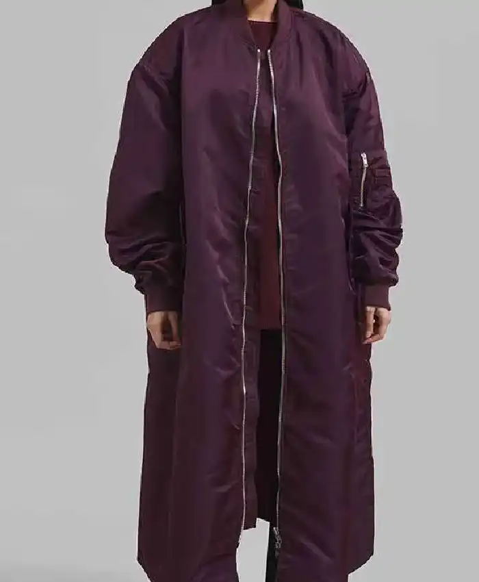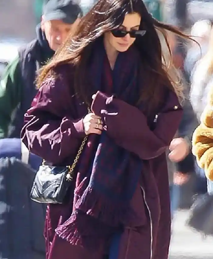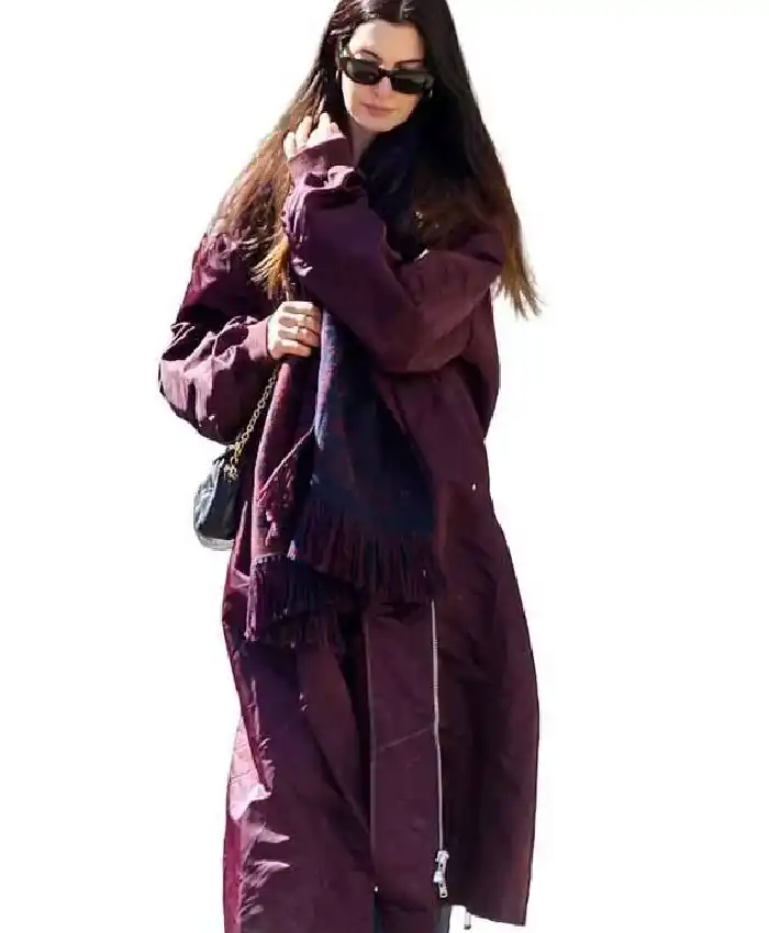 Anne Hathaway New York City 2026 Burgundy Bomber Long Coat On Sale For Women