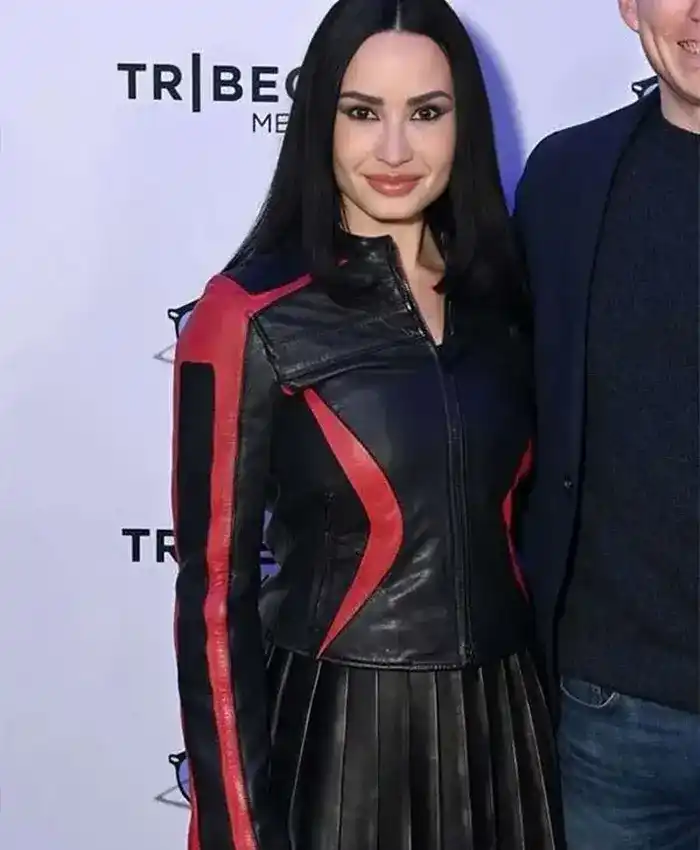 Demi Lovato New York City 2026 Black and Red Biker Leather Jacket On Sale For Women