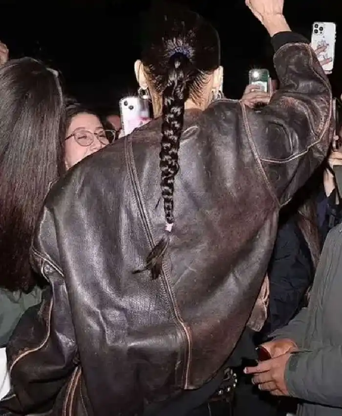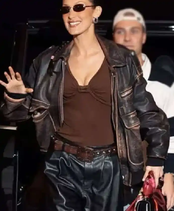 Bella Hadid NYC Street Style Brown Distressed Leather Jacket For Women