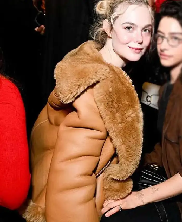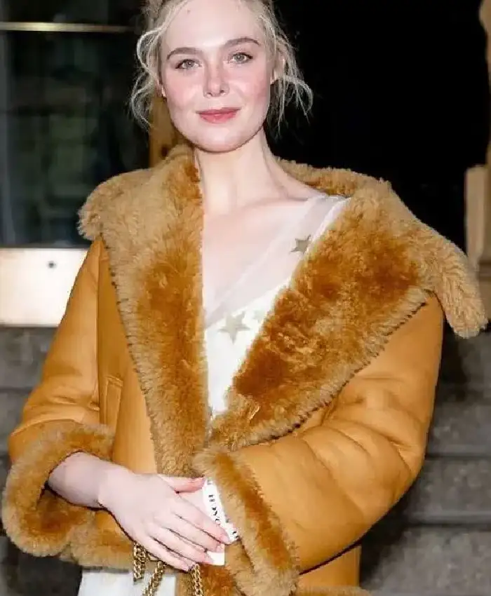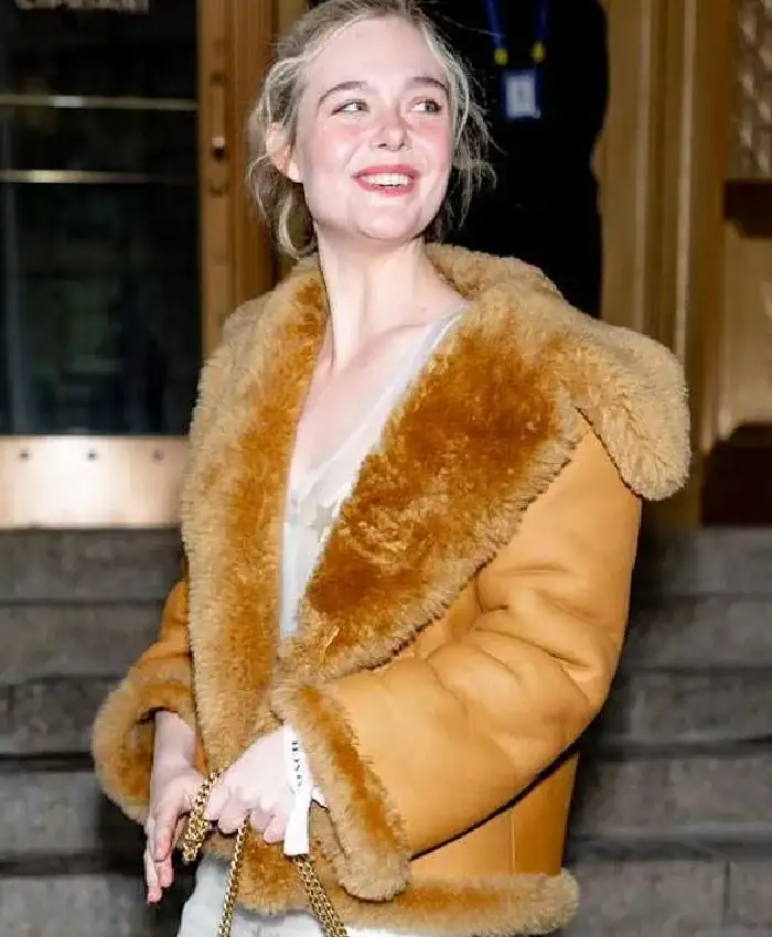 Elle Fanning New York City 2026 Brown Shearling Leather Jacket For Women