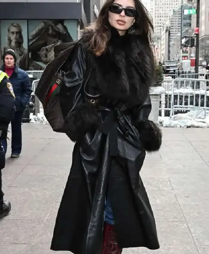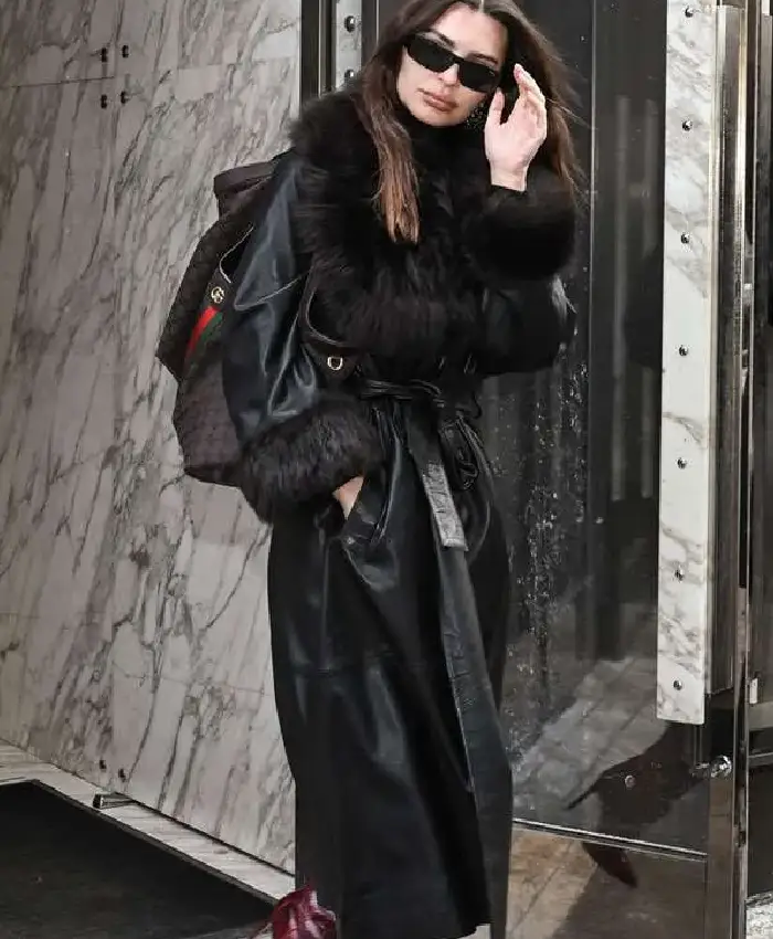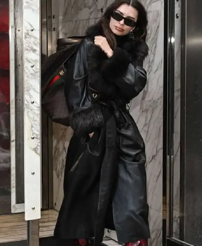 Emily Ratajkowski New York City 2026 Black Leather Trench Coat For Women