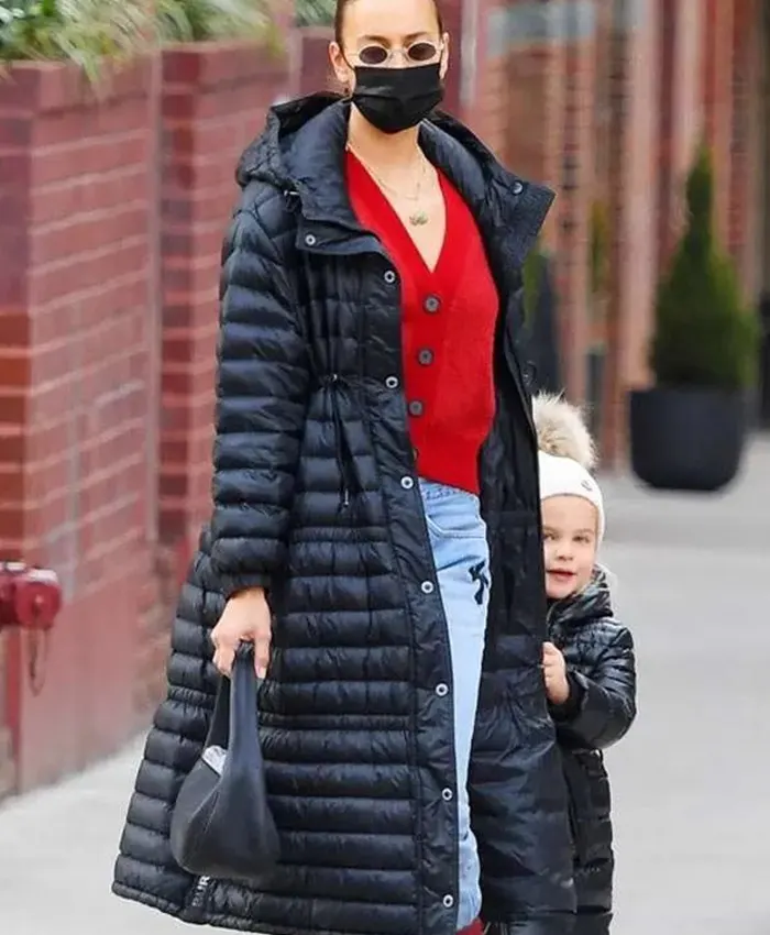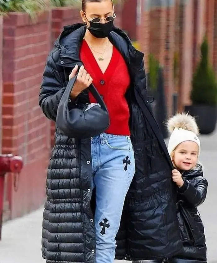 Styling this celebrity streetwear coat is effortless because it is built in a versatile black so that you can match it with various colors. You can pair it with white for a balanced look or layer it like a monochrome fit for a solid and classic appeal, and it looks super attractive when paired with other vibrant colors like red, similar to how Irina is layering, delivering a jaw-dropping look. Whether you pair the celebrity-inspired hooded coat with denim pants or jeans and layer it over a turtleneck and boots, its elegant appeal always works.
