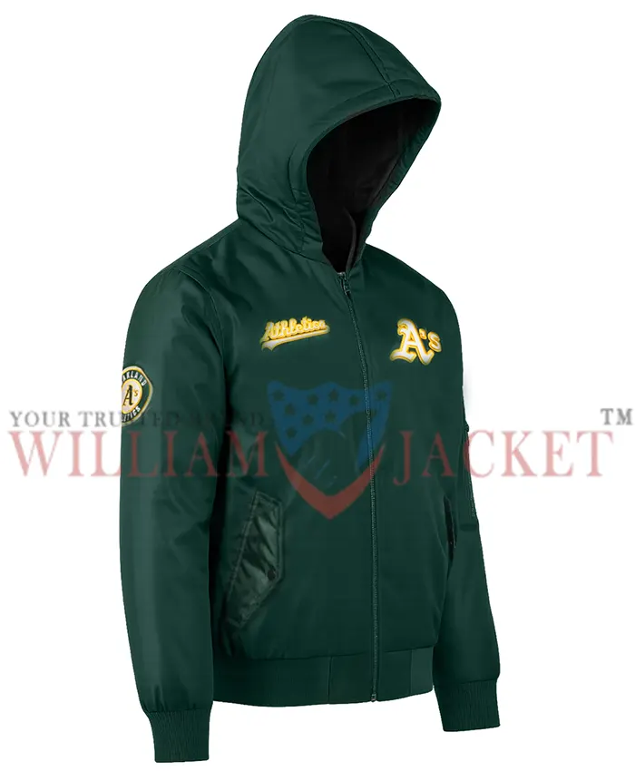 The spirit of Oakland baseball has always been about spirit, not just numbers. Thanks to their relentless determination and underdog fire, the Oakland Athletics have composed a story that is equal parts genius and rage. From Oakland’s golden years in the 1970s all the way to the legendary Moneyball years, the A’s have always played the game their own way brash, calculated, and unyielding with their swagger. And the Oakland Athletics Historic L-2B Green Hooded Bomber Jacket, specifically designed for the fan who does more than watch, is plugged into that same spirit.