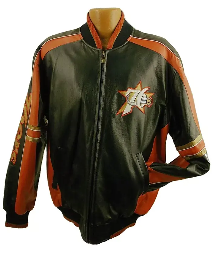 Philadelphia 76ers Vintage Leather Zipper Jacket For Mens and Womens on Sale