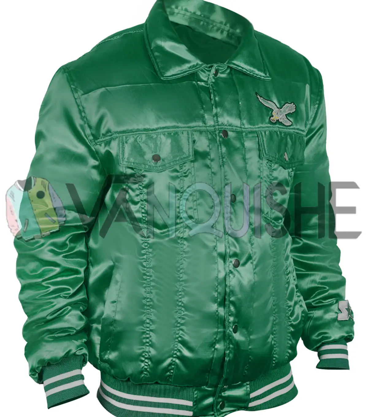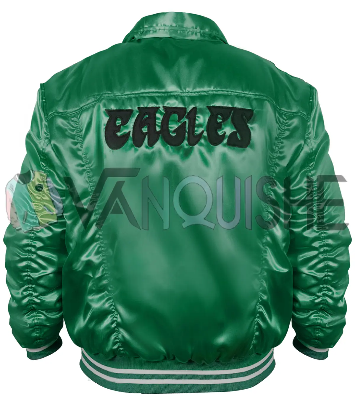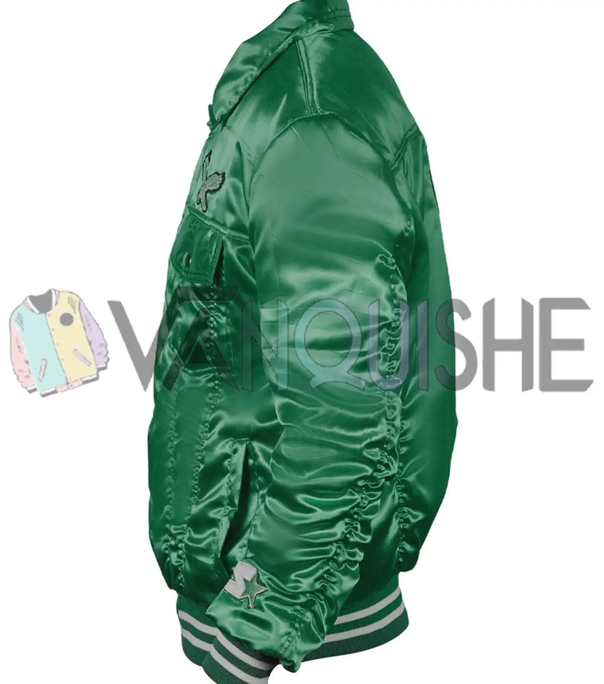 Made in an appealing green shade, the jacket becomes a versatile piece; you can layer it over a white tee, black jeans and joggers for a cool casual look or make a streetwear appearance by wearing it with cargo or tapered pants and high-top shoes for a retro streetwear look. the green color is giving the authentic Philly fan vibe. Order the Philadelphia Eagles Silver Tab jacket online from the Philadelphia Eagles Outfit collection.