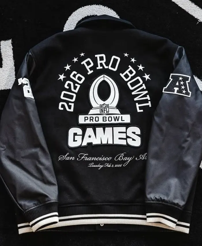 The 2026 Pro Bowl Game Bomber Jacket is crafted for fans who love both comfort plus bold style. In addition, it is fabricated with a warm wool body as well as stylish leather sleeves, giving it a classic varsity look. Furthermore, it boasts an inner viscose lining that makes the jacket soft as well as comfortable, so that you can wear it at any outdoor event.