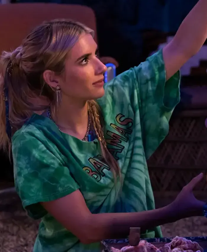 In Space Cadet (2024), Emma Roberts wears a striking tie-dye shirt that perfectly aligns with her character’s vibrant and daring persona. The shirt features a unique set of colors in a classic tie-dye pattern, adding a fun and colorful touch to her wardrobe.