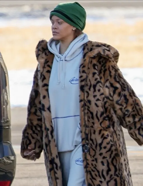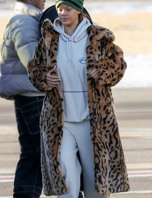 Barbadian Singer Rihanna Leopard Print Fur Long Coat For Women