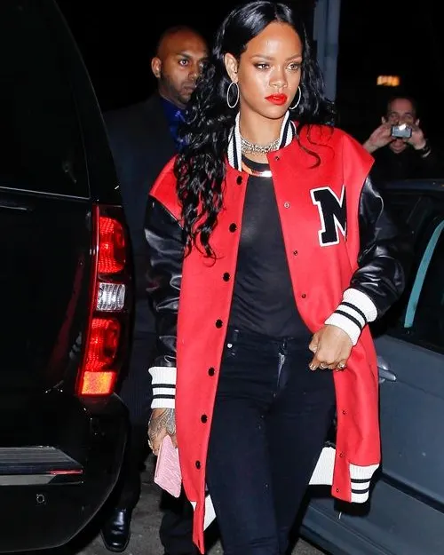 Rihanna Oversized Red and Black Varsity Bomber Jacket On Sale