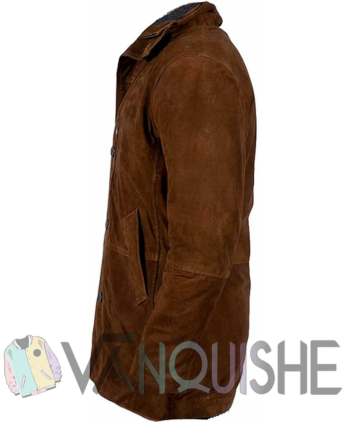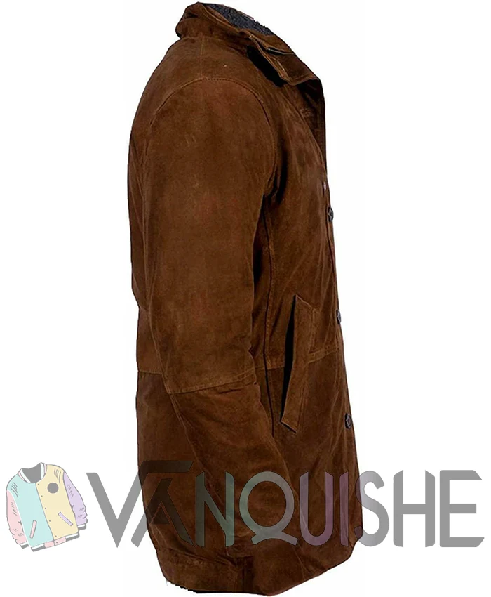 The Robert Taylor Longmire Brown Leather Trench Coat captures that same no-nonsense presence. It’s built from suede leather, giving it a raw, natural look that fits right into wide-open spaces or city streets. The coat is fully lined with viscose, so it feels smooth and easy to wear, even during long hours or colder days.
