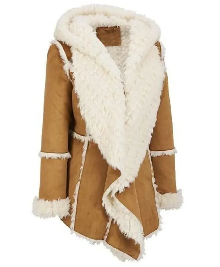 Astonishing Robyn Women’s Brown Shearling Sheepskin Suede Leather Hooded Overcoat Long Coat