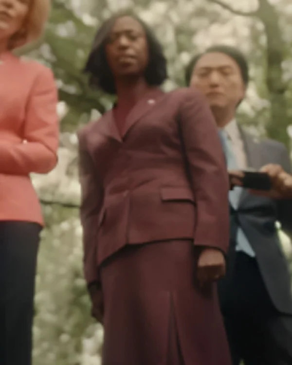 In the 2024 film Rumours, Nikki Amuka-Bird gives a great performance as a smart and stylish character dealing with a world full of secrets and lies. One memorable scene shows her wearing a tailored blazer that shows off her strength and elegance, making a bold statement during an important negotiation. The blazer not only boosts her confident look but also symbolizes her character’s resilience and grace.