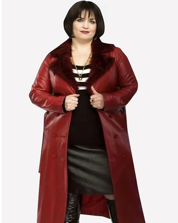 Ruth Jones TV Series Gavin and Stacey 2024 Nessa Jenkins Red Shearling Leather Trench Coat