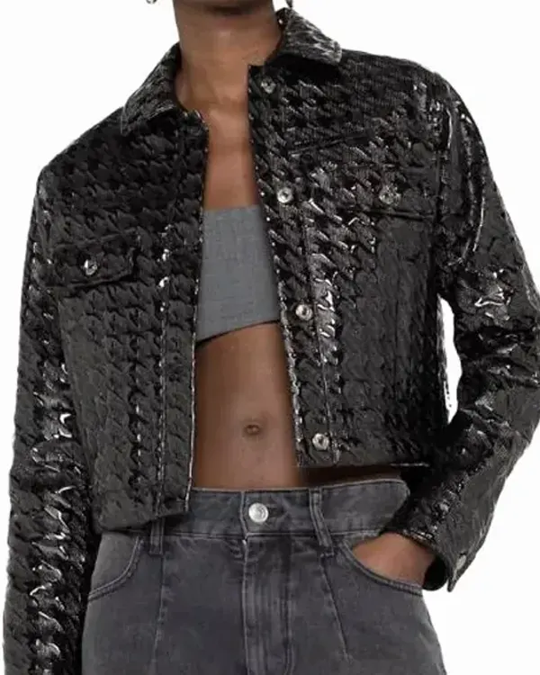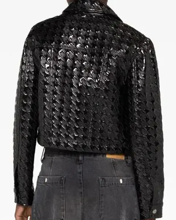 Selena Gomez Houndstooth-Pattern Black Crop Leather Jacket For Women