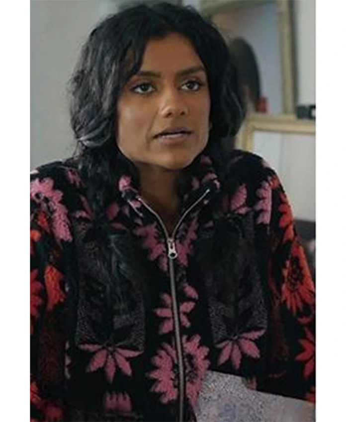 Pia Movie Picture This 2025 Simone Ashley Black and Pink Floral Jacket