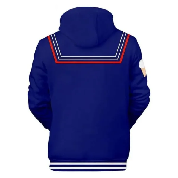 Inspired by the character Steve Harrington from the famous Netflix series, the “Stranger Things Scoops Ahoy Steve Cosplay Hoodie” is a popular Halloween piece. With its recognizable blue and white pattern, sailor collar, and customized name tag, this hoodie perfectly captures Steve’s summertime work at the Scoops Ahoy ice cream shop.