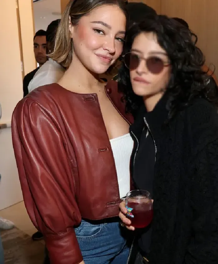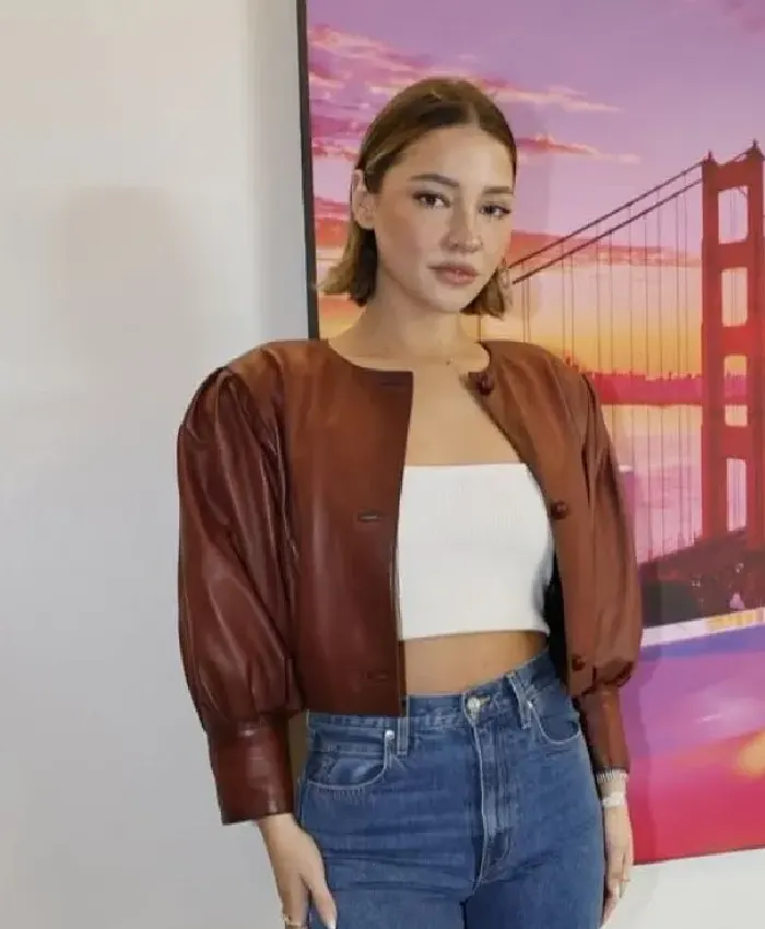 Madelyn Cline Super Bowl 2026 Cropped Style Brown Leather Jacket For Women
