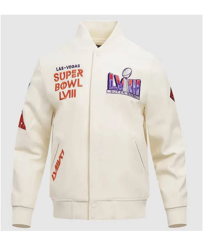What makes the Super Bowl LVIII White Varsity Jacket special? This jacket blends sporty style with premium materials, celebrating the Super Bowl spirit in a clean and modern design.