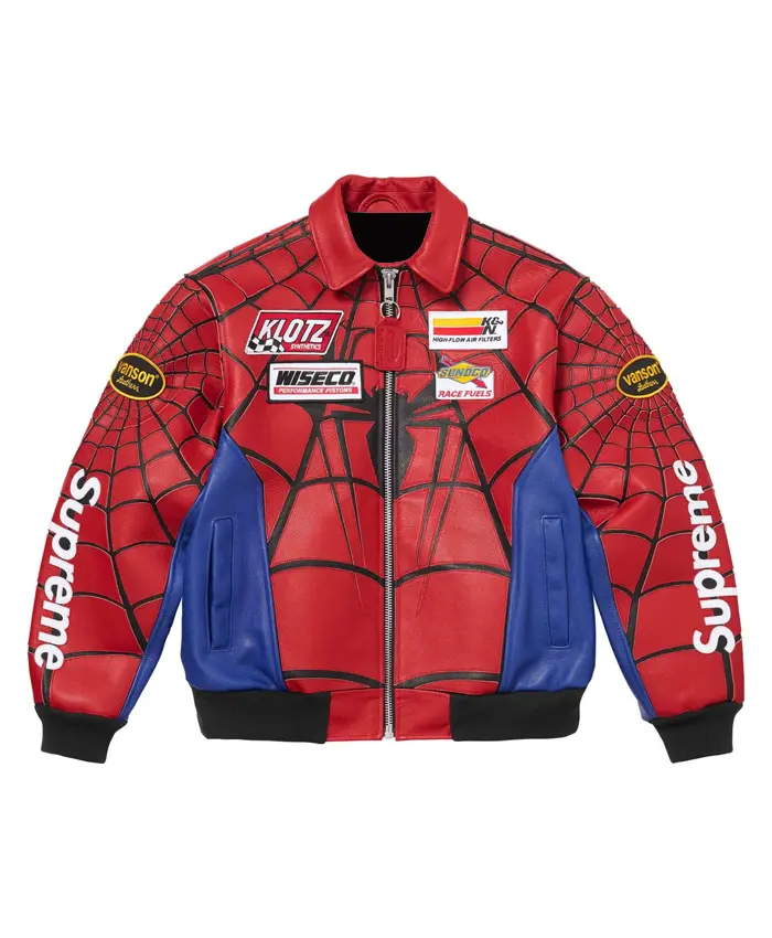 The supreme spiderman jacket stands out due to its eye-catching design plus modern details. It is crafted from high-quality PU leather, it gives a smooth plus stylish look while staying lightweight. Furthermore, the soft viscose lining inside makes it easy to wear all day. Whether you choose the red plus blue version or the supreme spiderman jacket black, both colors offer a strong appearance.